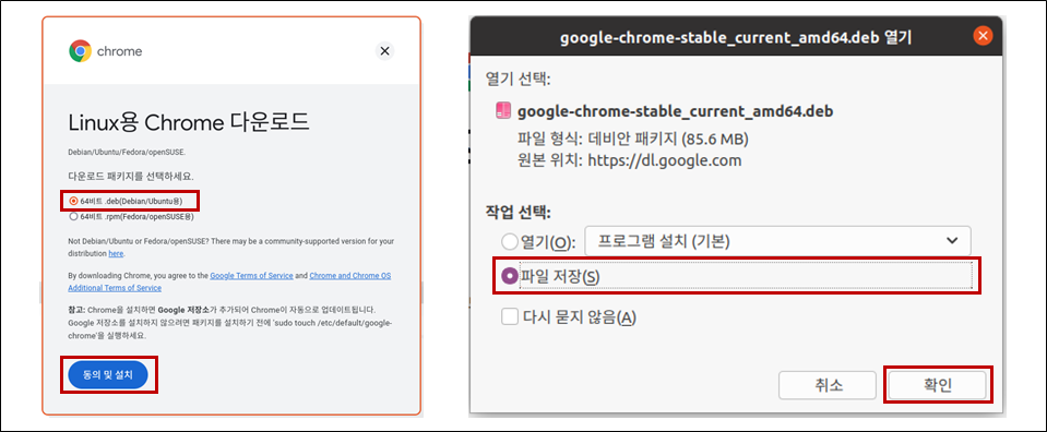다운로드를 누르면 아래와 같이 다운로드 팝업이 뜹니다. 우분투에 설치해야 하므로 데비안(debian)/우분투(ubuntu) 용 설치 파일인 .deb를 선택 후 동의 및 설치를 눌러주세요. 그 후 파일 저장버튼을 누르고 확인을 눌러주세요.
