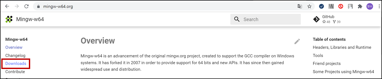 윈도우용 GCC 컴파일러 설치 파일은 https://www.mingw-w64.org/ 에서 다운받을 수 있습니다. 해당 사이트에 접속 후 다운로드(Downloads)로 들어가 주세요.