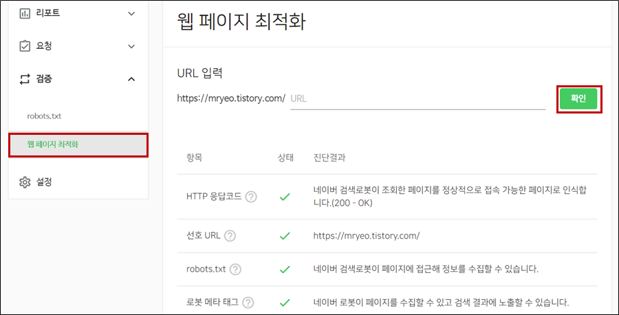 이외에도 요청 -> 웹 페이지 수집에서 등록한 글의 URL을 수동으로 입력해 노출 확률을 높이는 방법도 있으나, 네이버 검색로봇이 열심히 수집해 시간이 지나면 자연스럽게 노출이 된다고 하니 선택적으로 하시면 됩니다.