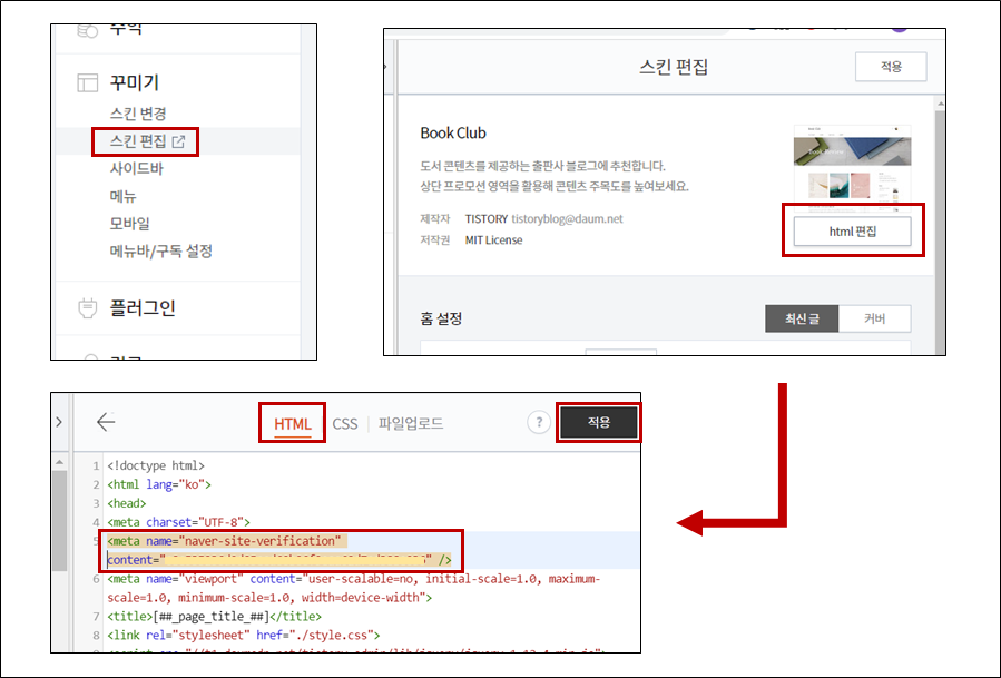 그 후 꾸미기의 스킨 편집 -> html 편집에 들어가 <head> </head> 사이 적당한 위치에 복사한 메타 태그를 붙여 넣어 주세요. 저는 아래와 같은 위치에 붙여 넣었습니다.