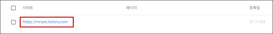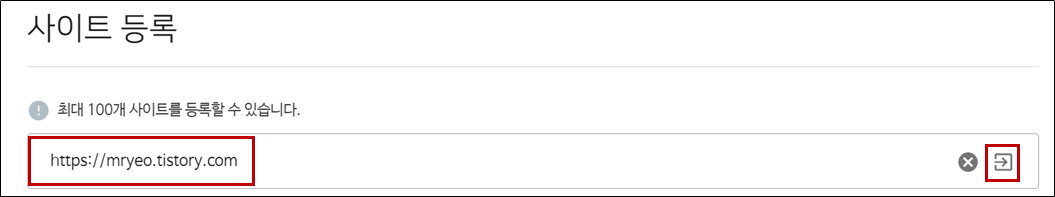 그 후 사이트를 등록해주어야 합니다. 등록하고자 하는 자신의 블로그 URL을 그대로 복사하여 등록해주세요. 저의 경우 https://mryeo.tistory.com 입니다.