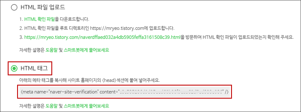 여기서부터 중요합니다. HTML 파일 업로드와 HTML 태그 두 가지 옵션이 있는데, HTML 태그를 선택해 주세요. 그리고 아래 나와있는 메타 태그를 복사해주세요.