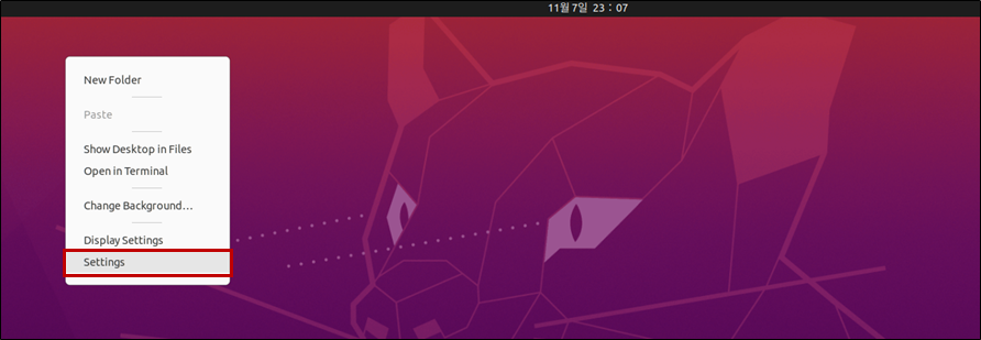 리눅스 우분투 운영체제를 설치하면 기본적으로 아래와 같은 배경 화면으로 설정됩니다. 배경화면을 변경하기 위해선 마우스 우클릭 -> 설정(Setting)으로 들어가 주세요.
